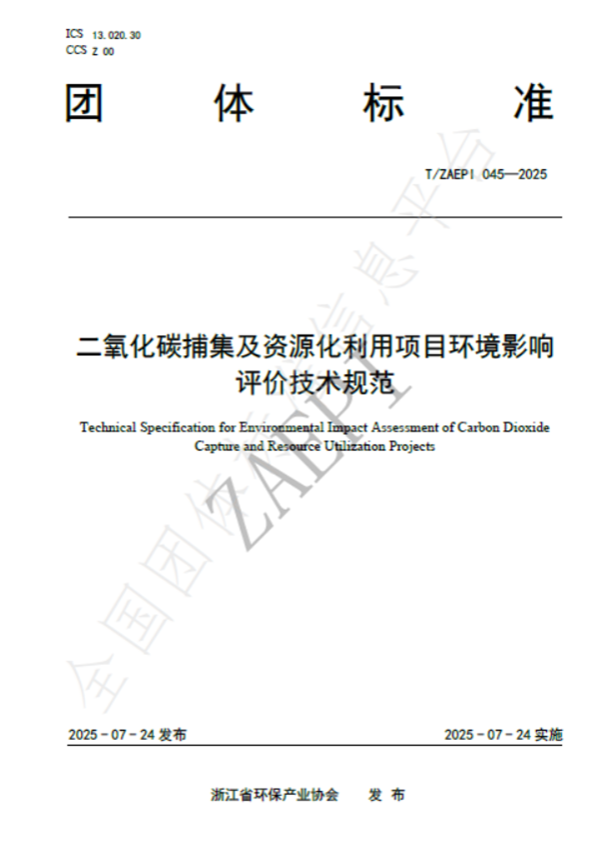 2025年7月24日,由浙江省環(huán)保集團生態(tài)環(huán)保研究院牽頭制定的《二氧化碳捕集及資源化利用項目環(huán)境影響評價技術規(guī)范》(T/ZAEPI 045-2025)團體標準正式發(fā)布并實施。該標準由浙江省環(huán)保產業協會歸口管理,聯合省內多家環(huán)保領域骨干企業共同起草,填補了工業領域二氧化碳捕集及資源化利用項目環(huán)評技術規(guī)范的空白。